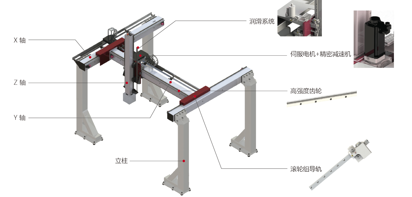 主体横梁采用钢梁结构,导轨采用滚轮式导轨。传动采用齿轮齿条方式,模块化设计。